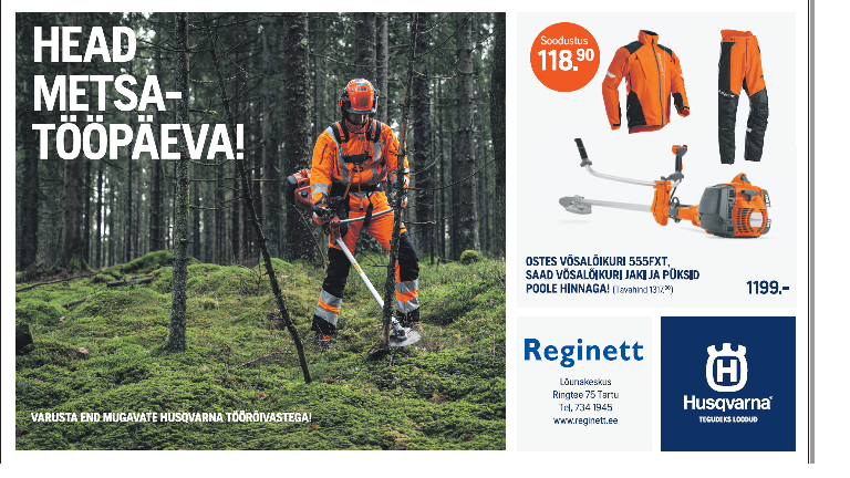 Uuel aastal uue hooga mine metsa uue saega. Husqvarnal on selleks talveks palju häid pakkumisi nii saagidele, võsalõikurile kui ka kaitseriietele. Kampaania kehtib Reginetis 25.01-14.03.2021.https://www.husqvarna.com/ee/tooted/kehtivad-pakkumised/